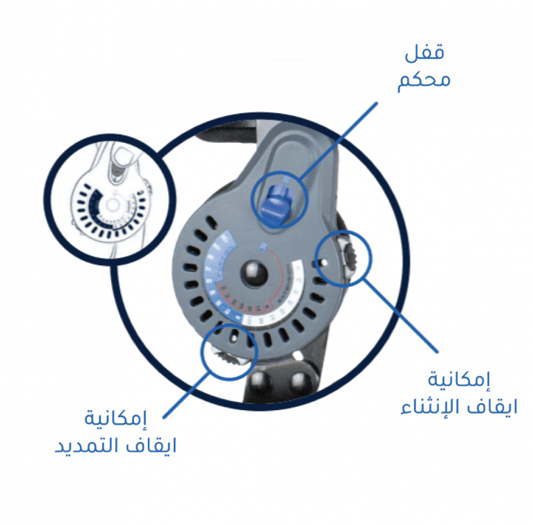 • مفصلات ROM مع أقفال قابلة للإسقاط وإعدادات ثني وتمديد قابلة للتعديل بدون أدوات